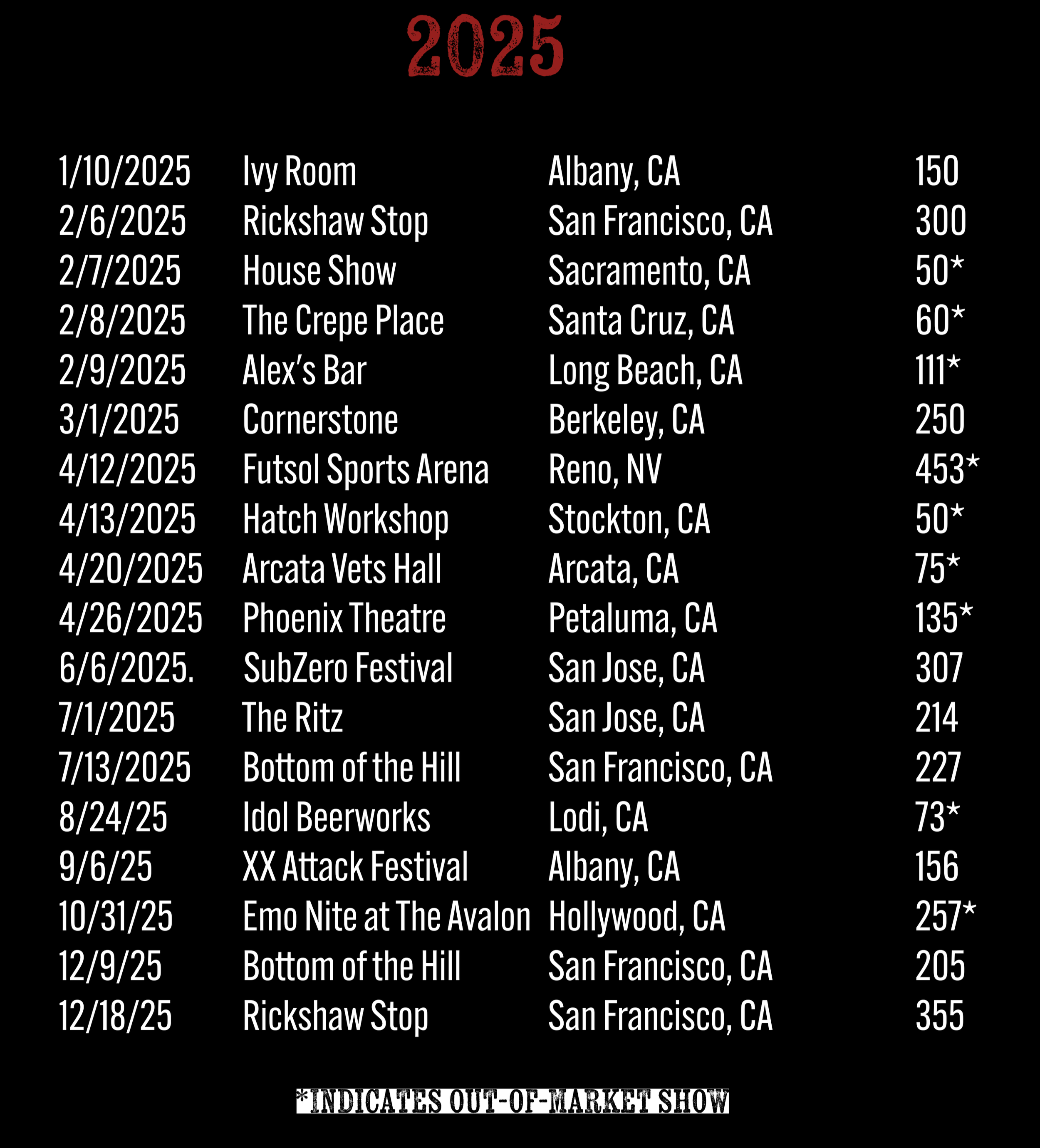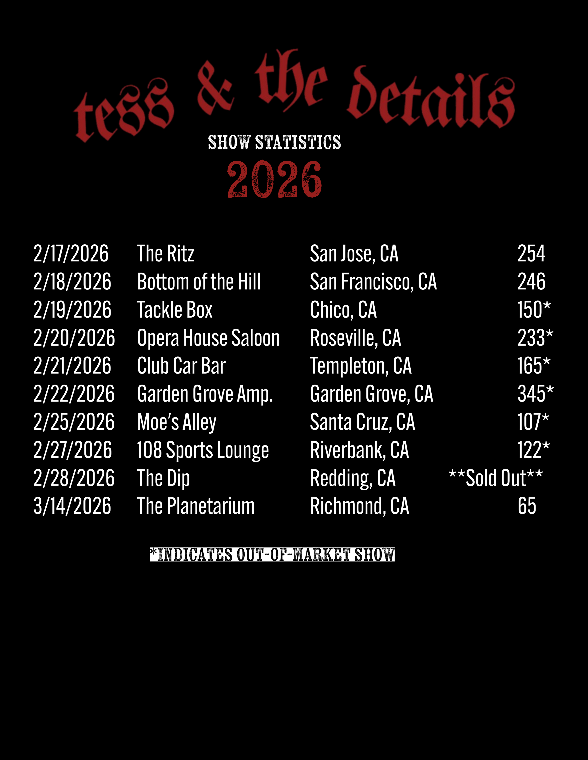 The Details have notably played alongside Fishbone, Swingin’ Utters, The Meteors, The Last Gang, The Drowns, and many more. They have toured regionally on big stages, in clubs, and backyards.